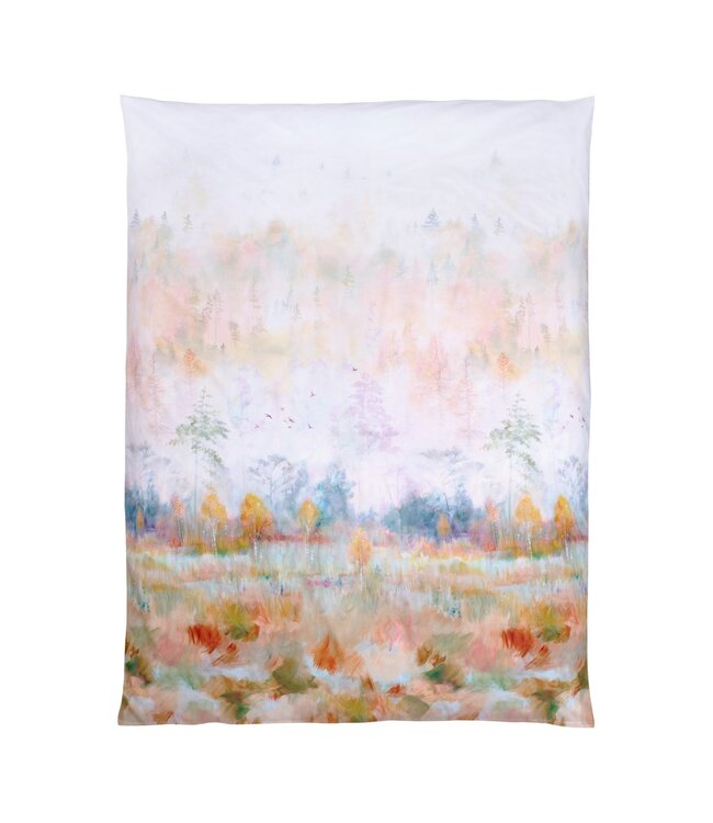 Het Christian Fischbacher Aurum dekbedovertrek brengt een warme, herfstachtige sfeer naar de slaapkamer. Rijke tinten oker, rood en groen laten bomen en grassen subtiel oplichten, terwijl zachte nevelslierten over het landschap zweven. Het dessin oogt luchtig en verfijnd, met een elegante overgang naar helder wit. Dit artistieke ontwerp, met de hand geschilderd in het atelier, creëert een rustgevende en stijlvolle ambiance.