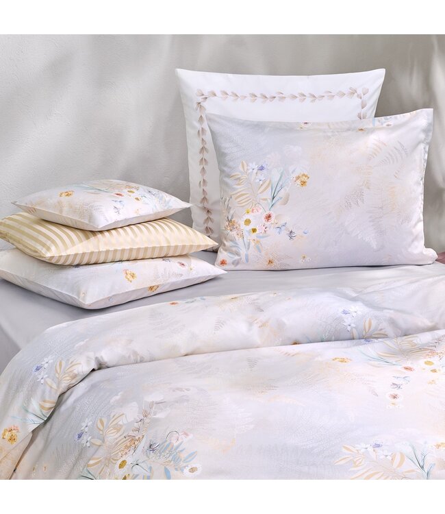 Het Christian Fischbacher Eternity dekbedovertrek ademt rust, elegantie en symboliek. Het varenmotief, dat staat voor duurzaamheid en eeuwigheid, vormt de basis van dit verfijnde dessin. Rijke boeketten van hortensia’s, klaprozen en Afrikaanse lelies vloeien harmonieus samen met de fijn getekende bladeren. De zachte tinten zilver, beige en goud zorgen voor een luxueuze en tijdloze uitstraling die moeiteloos in diverse interieurs past.