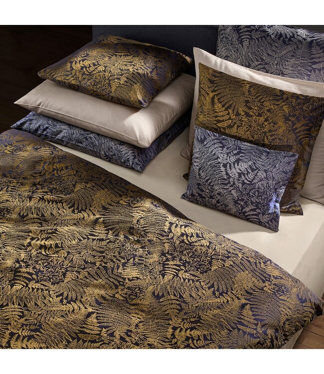 Luxe katoensatijnen dekbedovertrek met varenmotief op donkerblauwe ondergrond, verkrijgbaar in goud, zilver en blauw. Elegant en verfijnd design. Lees meer.