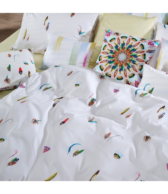 Het Christian Fischbacher Feathers dekbedovertrek is een speelse en verfijnde interpretatie van het iconische verenmotief. De handgetekende verenboeketten verwijzen subtiel naar de glamour van de jaren twintig, waarin exotische veren een belangrijk onderdeel waren van de mode. Losjes verspreid over de heldere, witte ondergrond zorgen ze voor een fris en licht geheel. Het resultaat is een elegant ontwerp met een vleugje nostalgie en een moderne uitstraling.