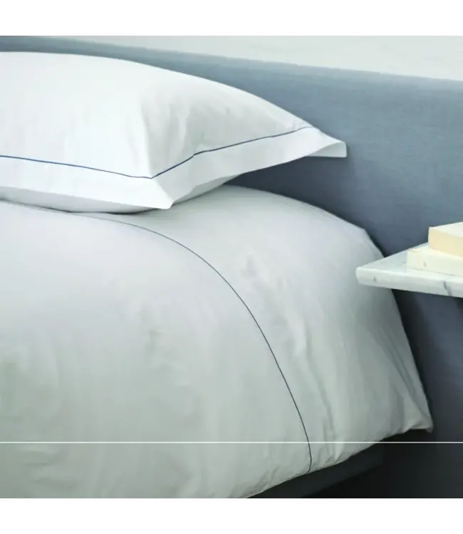 Lysdrap Linea white dekbedovertrek gemaakt van 1000TC Satijn katoen is een uitzonderlijk luxe dekbedovertrek van zeer hoge kwaliteit. Dit witte dekbedovertrek is afgewerkt met een elegante geborduurde lichtblauwe bies van 2 mm. De bies zit op het dekbedovertrek en ook op de bijpassende kussenslopen. Satijn katoen is stevig, ademend, én duurzaam. Het gaat lang mee, pilt niet en behoudt zijn frisse uitstraling – ook na veelvuldig wassen.