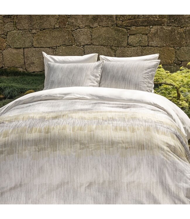 Het dessin van Corso is verfijnd en natuurlijk: zachte grijs-taupe lijnen vormen een licht, modern lijnenspel, terwijl een zachte geelgouden strook een warm kleuraccent toevoegt zonder te overheersen. Het geheel oogt rustig en discreet, ideaal voor wie houdt van een minimalistische maar warme sfeer. De bijpassende kussenslopen zijn uitgevoerd in hetzelfde rustige dessin, waardoor je bed meteen een harmonieus en uitnodigend geheel vormt.