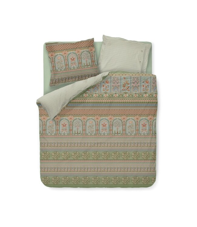 Het Pip Studio Bollywood Dreams dekbedovertrek brengt een vleugje exotische charme in je slaapkamer. Het dessin combineert verschillende bloemenmotieven met decoratieve boogjes die geïnspireerd zijn op Indiase paleisbogen. Tussen de bloemen verschijnen sierlijke boompjes die subtiel in het patroon overlopen en zorgen voor een rijk en verfijnd geheel. Draai je het overtrek om, dan ontdek je een speelse achterzijde met een tegelprint die zorgt voor een verrassend tweede dessin.