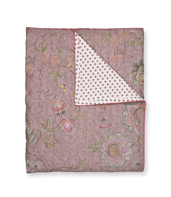 De Pip Studio Mumbai Morning quilt roze brengt direct een elegante en warme sfeer in je slaapkamer. Het verfijnde dessin bestaat uit grote fantasierijke bloemen en sierlijke takjes die samen een rijk en romantisch patroon vormen. De zachte roze tinten geven het geheel een dromerige uitstraling die prachtig tot zijn recht komt op ieder bed. Combineer de quilt met het Mumbai Morning dekbedovertrek voor een harmonieus en speels mix en match effect.