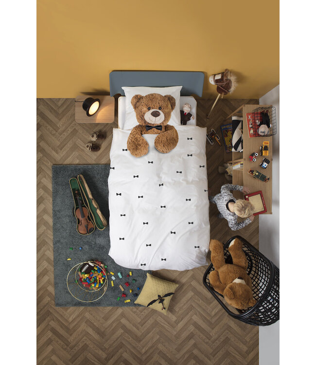 Snurk Teddy dekbedovertrek. Meestal heb je een favoriete knuffel en een favoriet dekbed. Maar wat als je dekbed bedrukt is met een enorme teddybeer? Dan knuffel je een beer en word je tegelijkertijd door een beer geknuffeld in je bed. Is het leven niet fantastisch?