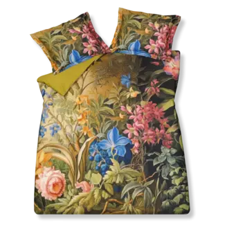Vandyck mystic garden multi dekbedovertrek heeft imposante bloemen in verschillende tinten roze en blauw, omgeven door grote bladeren en struiken. De achterkant van het dekbedovertrek is effen groen/oker. De kussens hebben aan beide zijden roze bloemen en een deel van de blauwe bloem. Door de digitale druk, komt de levensechte print helemaal tot leven. Tover je slaapkamer om tot een magische tuin met het Mystic Garden multi dekbedovertrek van Vandyck.