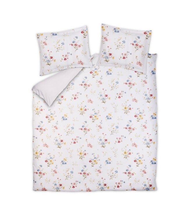 Het Vandyck Soft Fields Cream Tan dekbedovertrek brengt een verfijnde en rustgevende sfeer in de slaapkamer. Het dessin met kleine bosjes bloemen in roze, blauwe en gele tinten ligt subtiel verspreid over een off white ondergrond. Dit geeft het geheel een frisse, zachte en natuurlijke uitstraling. De uni achterzijde in off white zorgt voor extra balans en een kalm geheel.